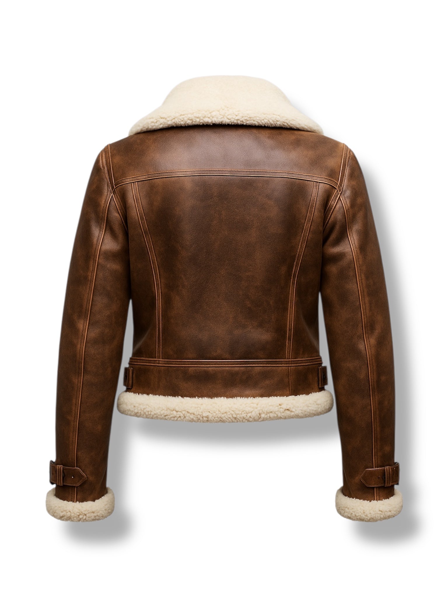 The Women’s Distressed Chocolate Brown Sheepskin B3 Faux Fur Aviator Leather Jacket is the epitome of classic aviator style blended with modern functionality. Crafted from high-quality distressed chocolate brown sheepskin, this jacket not only stands out with its rugged appeal but also offers lasting durability. The luxurious Sherpa shearling faux fur lapel collar, cuffs, and bottom hem ensure you stay warm even on the coldest days. A secure front YKK zipper closure and practical slanted zipper pockets add both style and utility, making this jacket perfect for any adventure. Whether you’re taking to the skies or simply looking for a stylish winter wear option, this leather jacket provides unmatched warmth, comfort, and timeless style.