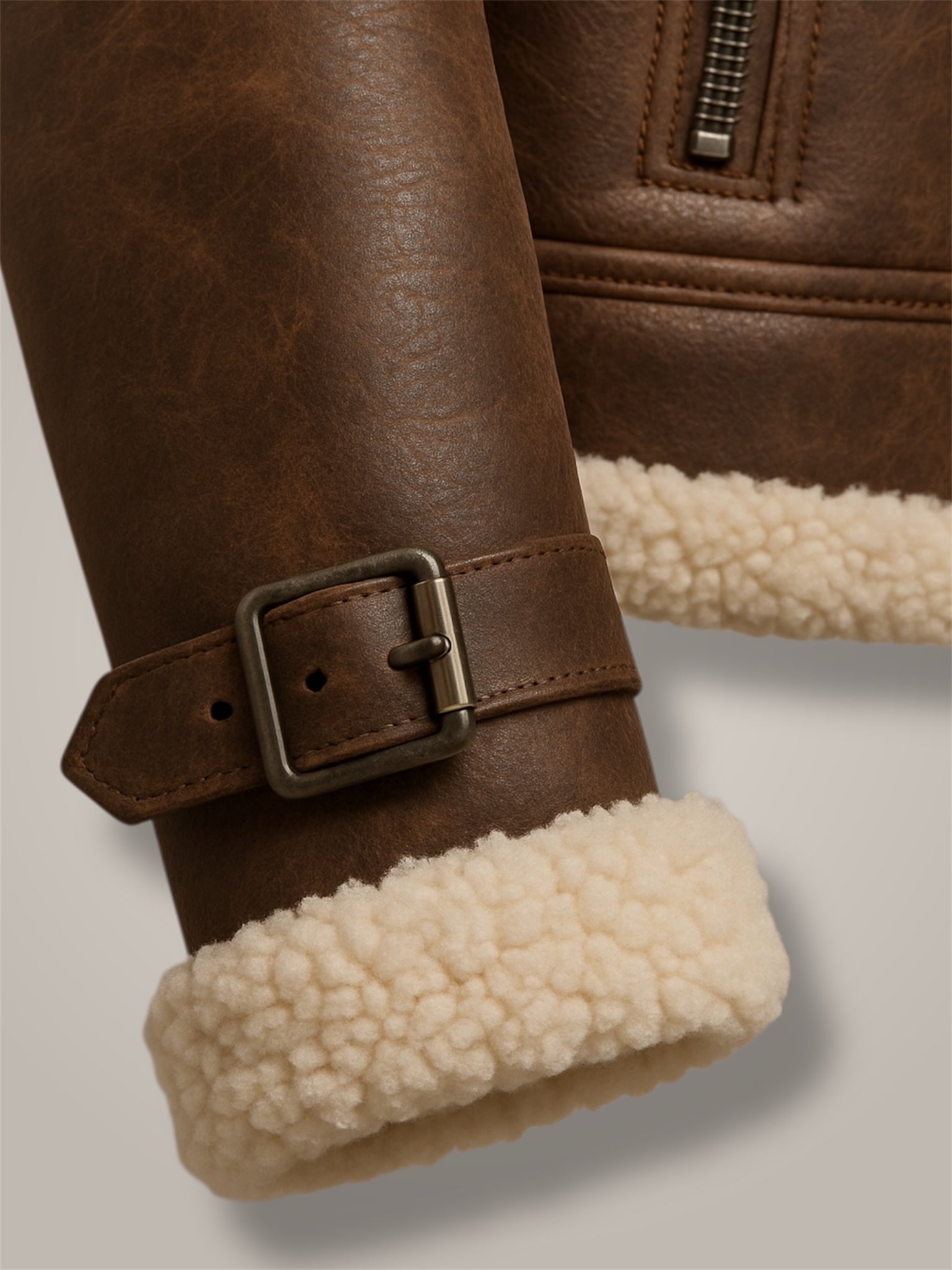 - Sherpa Shearling Faux Fur: Features A Plush Sherpa Shearling Faux Fur Lapel Collar, Adding Significant Warmth And Style To The Classic Flight Jacket.