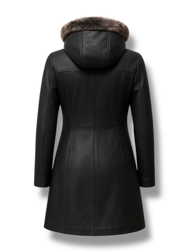 DUHA – Black Hooded Three-Quarter Leather Coat
