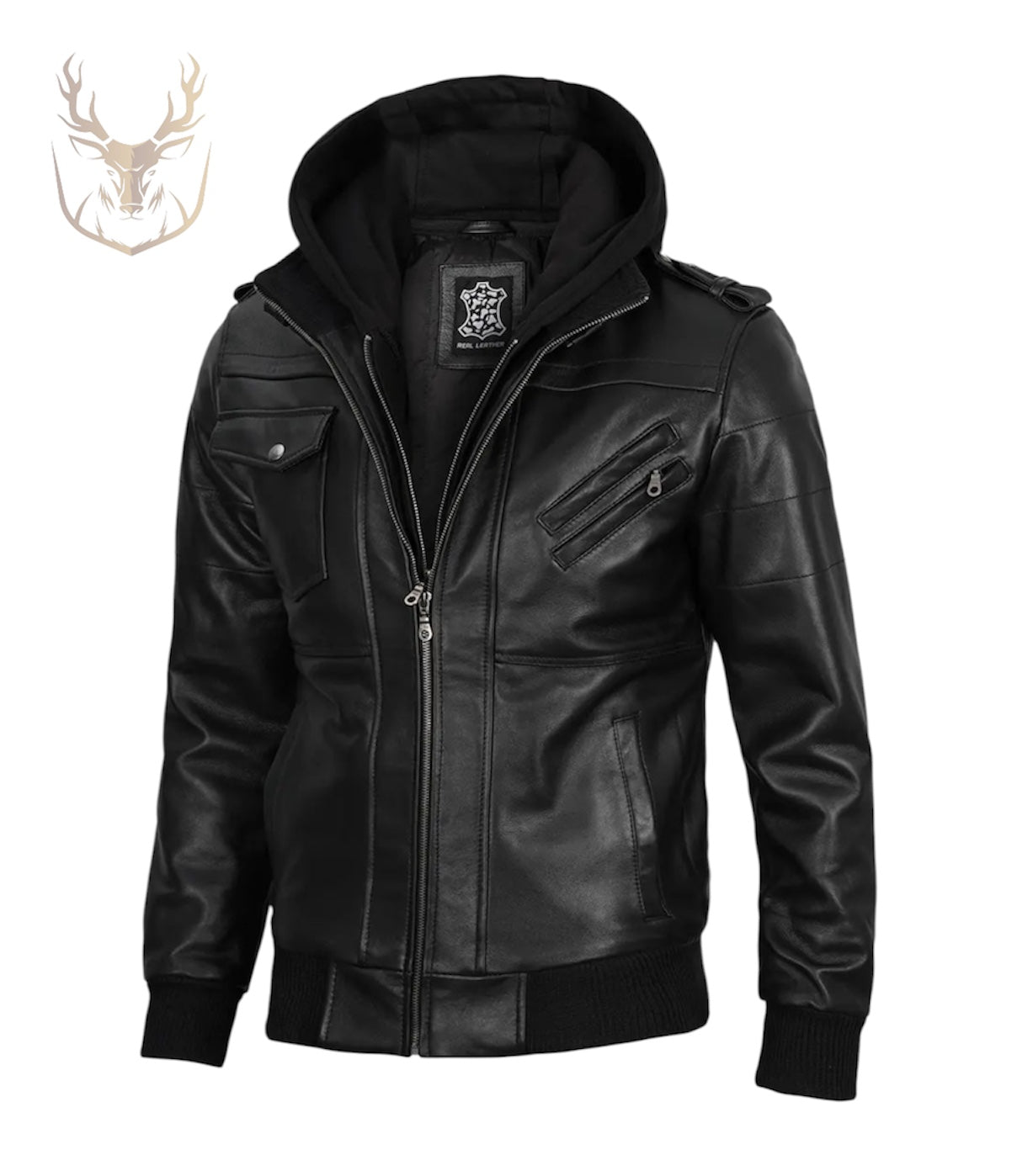 LuxeAura’s Hooded Black Bomber Leather Jacket For Men.